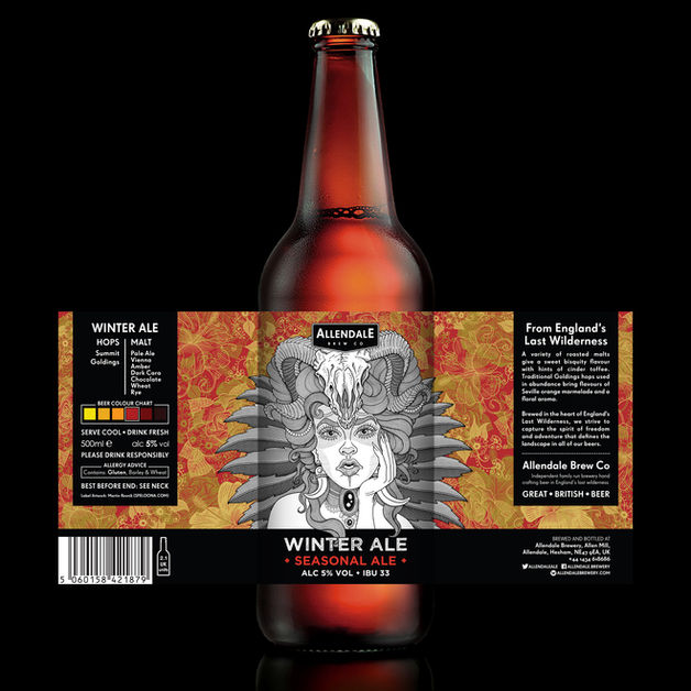 I was commissioned by Allendale Brewery to create a "generic" beer label design that could be used on various small batch beers. The first two beers the label was used on were Winter Ale (Christmas Special) and Beacon Pale Ale. The commission also included a complete redesign of the pump clip shapes and bottle and can label layouts. This is one of the four labels I've created for Allendale.
