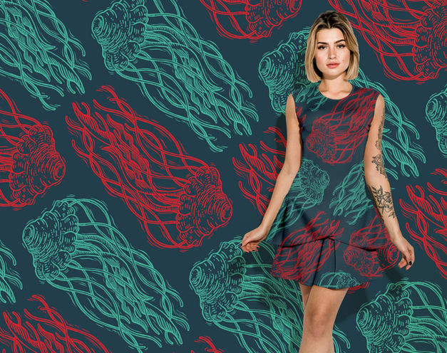 Selection of hand-drawn colourful patterns applied to women's apparel, t-shirts, iPhone cases, trainers.